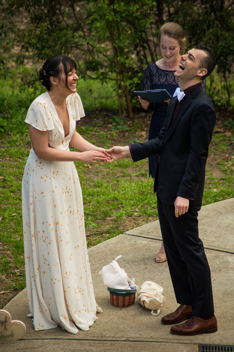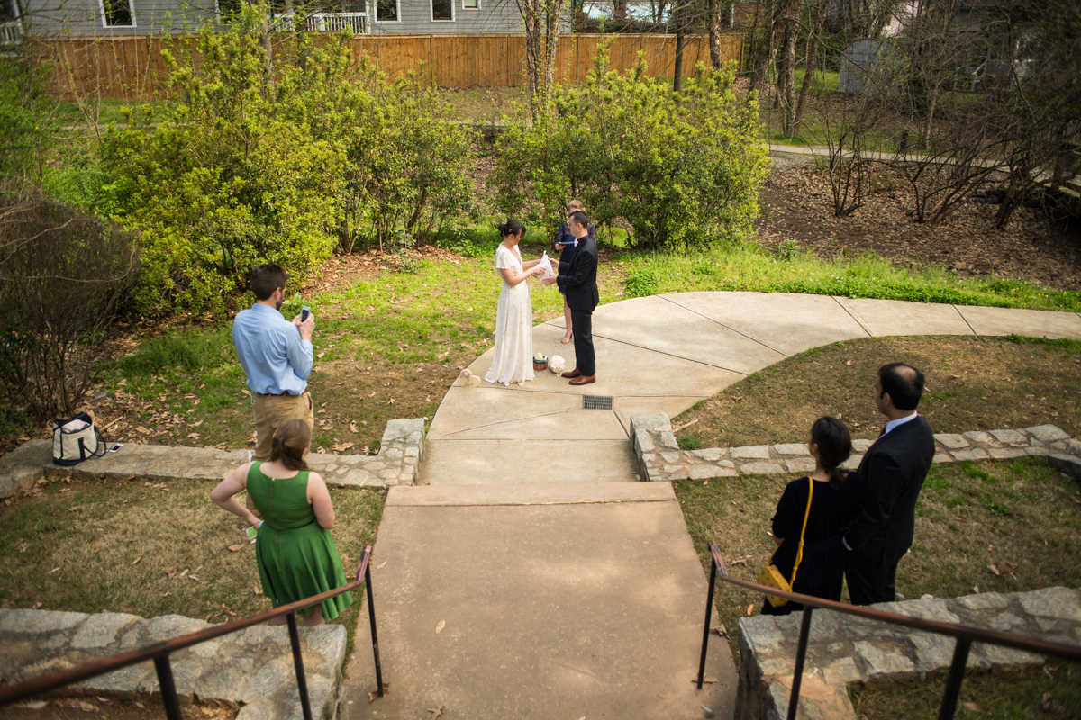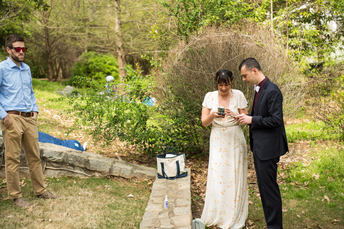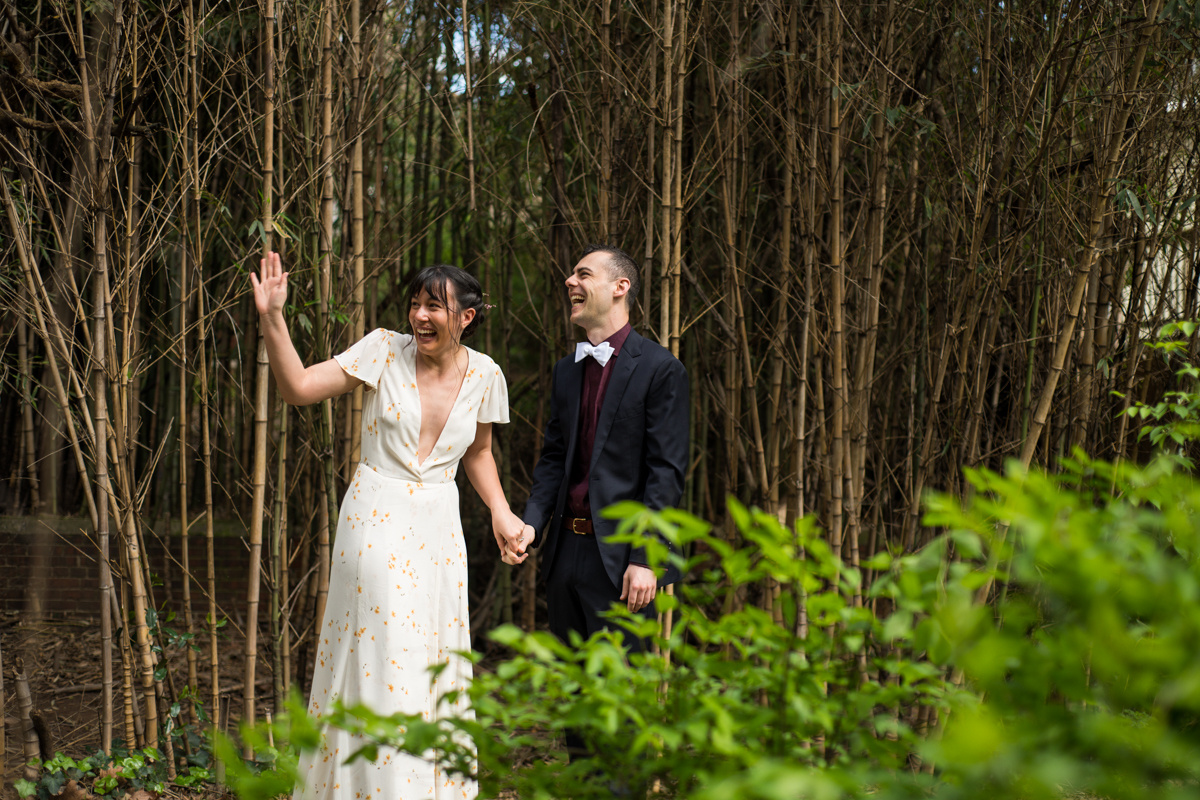 The day started off with Facetime calls with family members, each household at a time. All of their family spent the morning with the couple. It was (almost) like they would have in person, sending love and rejoicing in the excitement of the day. Steph & Jacob dressed independently, walked to the ceremony spot with one of the guests. And, then met back up in the bamboo along the back pathway of the park near their home.