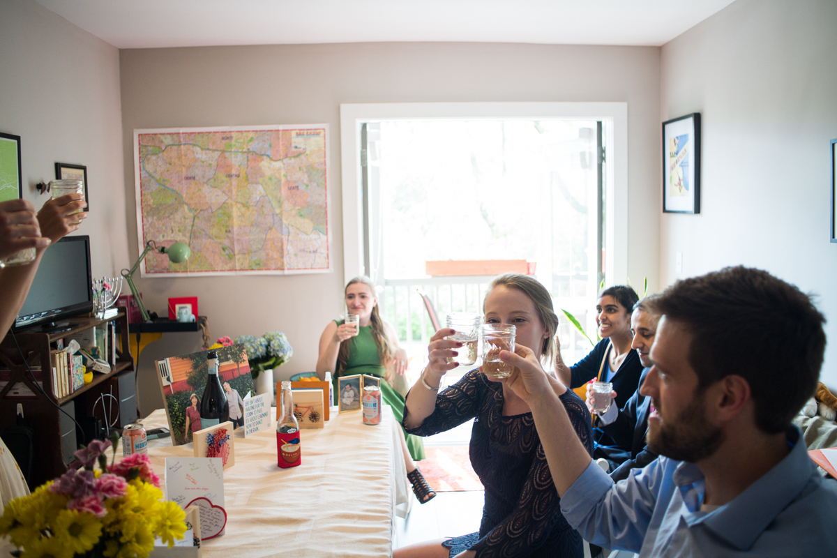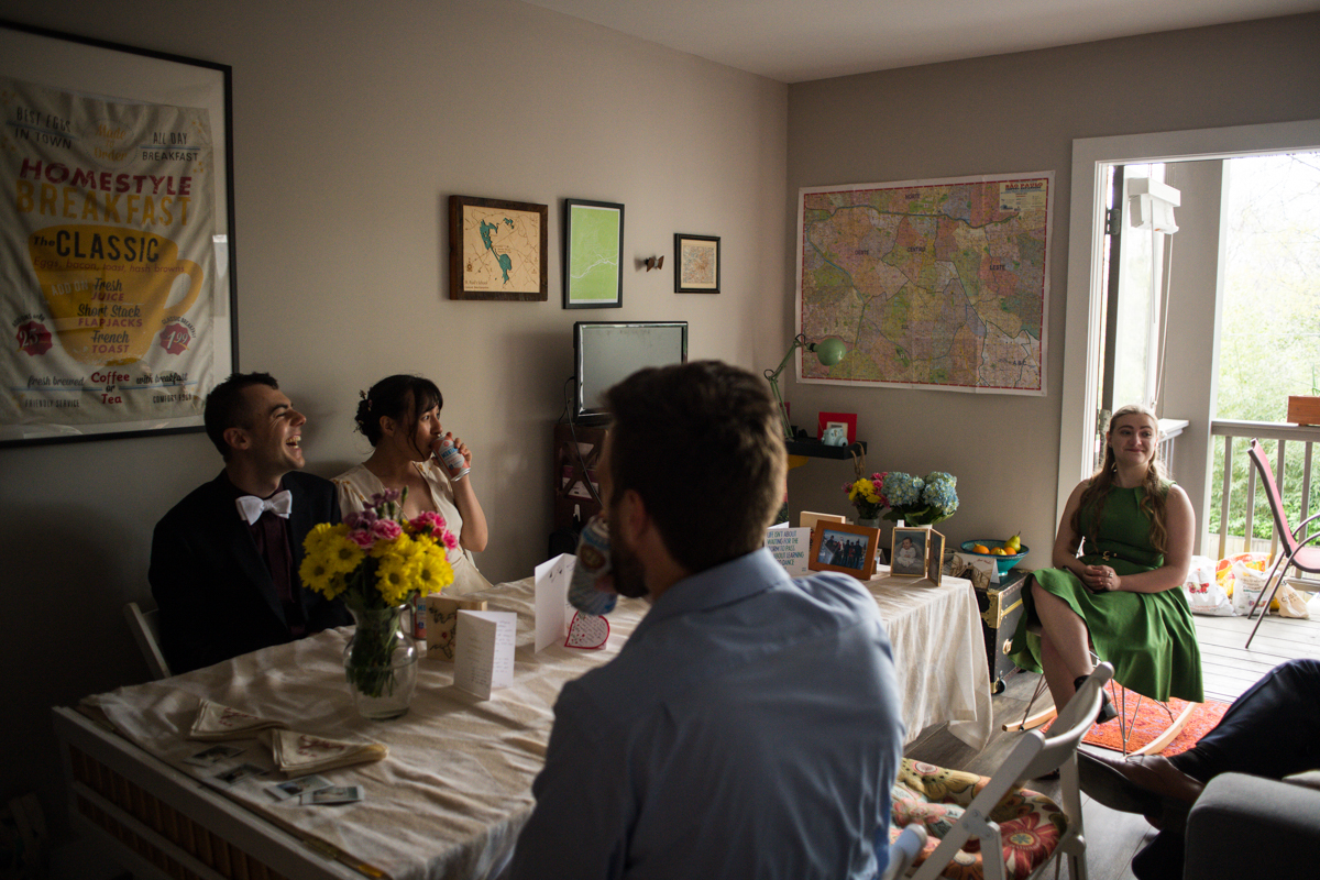 Post-ceremony, the couple had everyone over to their home. There, everyone enjoyed toasts and food from Fox Bros catering! They closed the night in a way similar to what the big day’s plans had been anyway, just miniaturized.