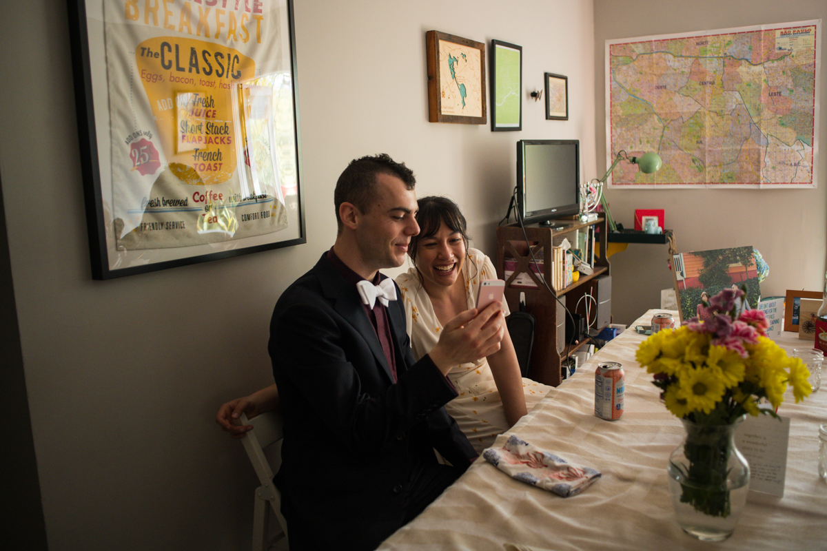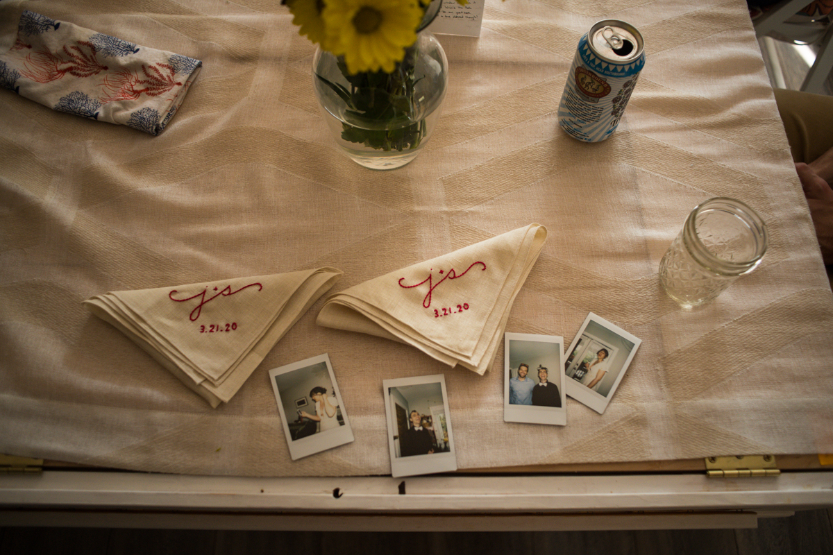 They met back up with their people, including an attendant-turned-officiant for the occasion, and got everything set up to be broadcast live so their loved ones could enjoy. The friends and family tuning in were all celebrating in their own ways from home: some in formalwear and some with champagne pours! The ceremony was full of important items incorporated from the larger wedding day plans. This including an heirloom tallit and the handmade string art that was to decorate the tables. There were beautiful vows… And, there was even a moment of bizarre levity as the ceremony was interrupted by a child on a scooter cutting through! {ah, the unpredictable nature of public parks!}