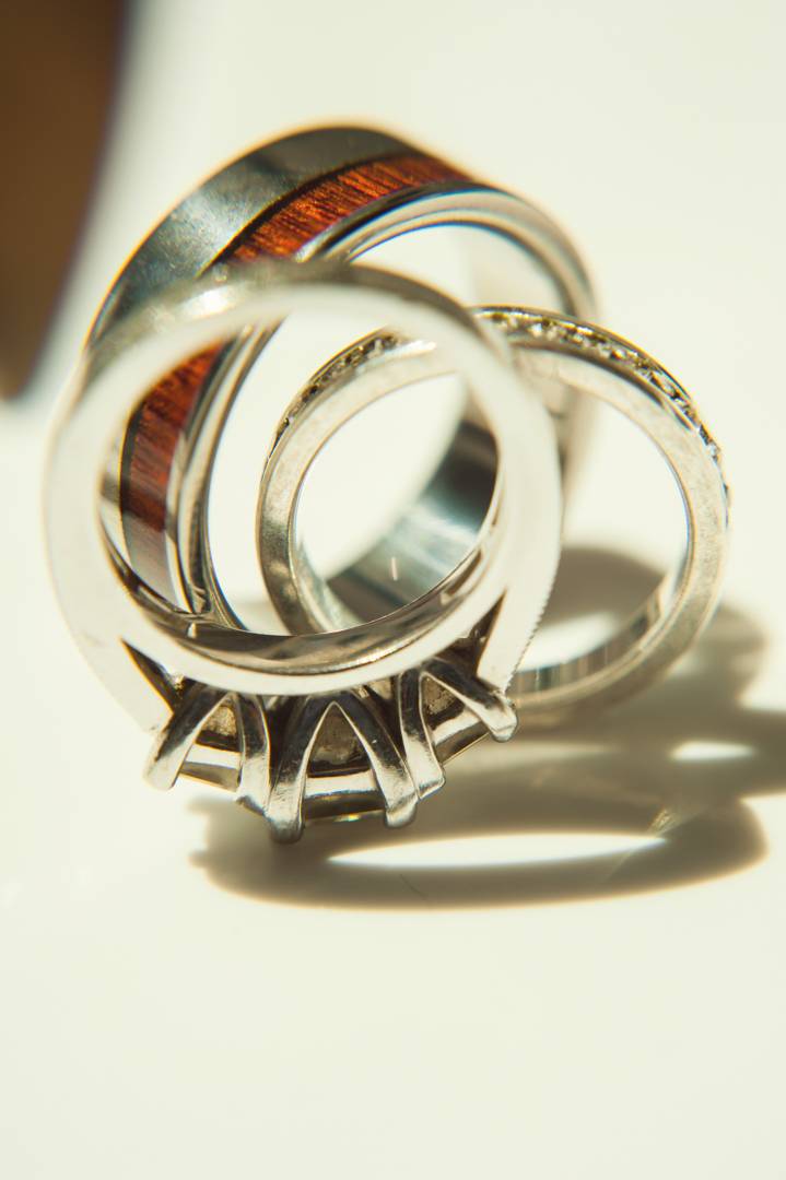 - Rings - engagement: John Muni Jewelers, Ohio; M’s band: Koa wood inlay, jewlerybyjohan via Etsy.com, J’s band: macys!