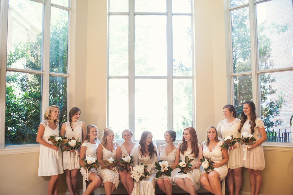 The couple had so many amazingly supportive people with them on their wedding day! And the day was full of old-fashioned touches and decor mixed in with some classic Southern elements like magnolia leaves: every aspect was chosen with consideration and chock full of meaning.